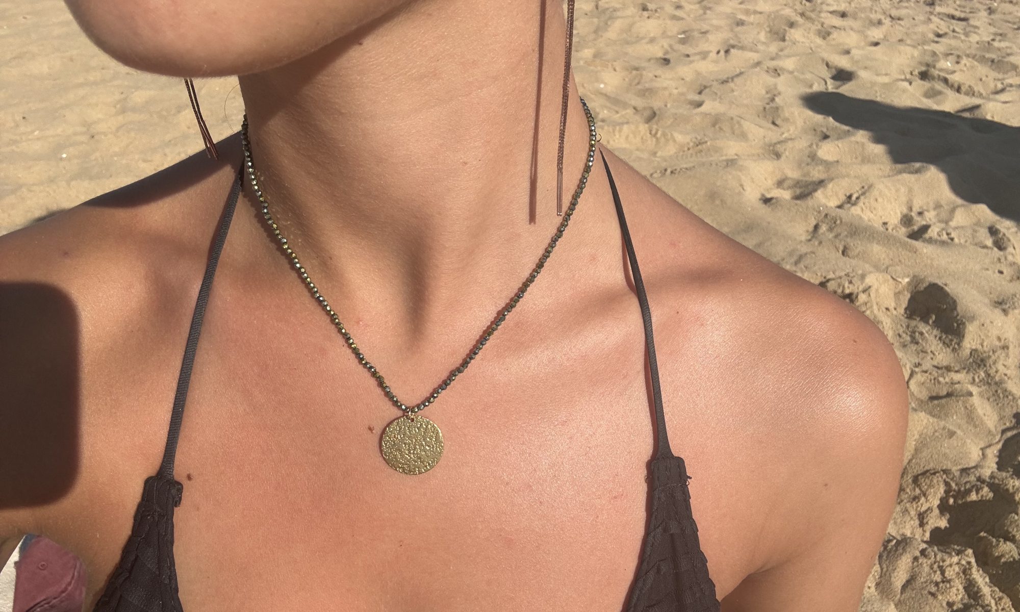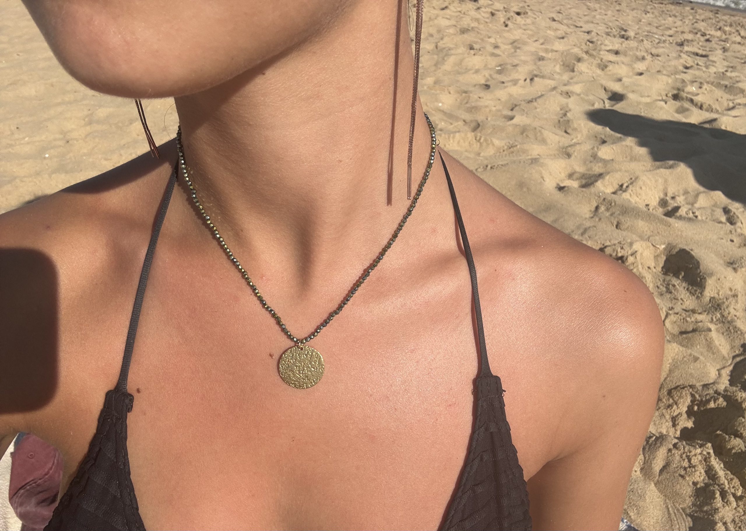 collar Lucía bolitas verde militar y chapita color oro, enganche color oro