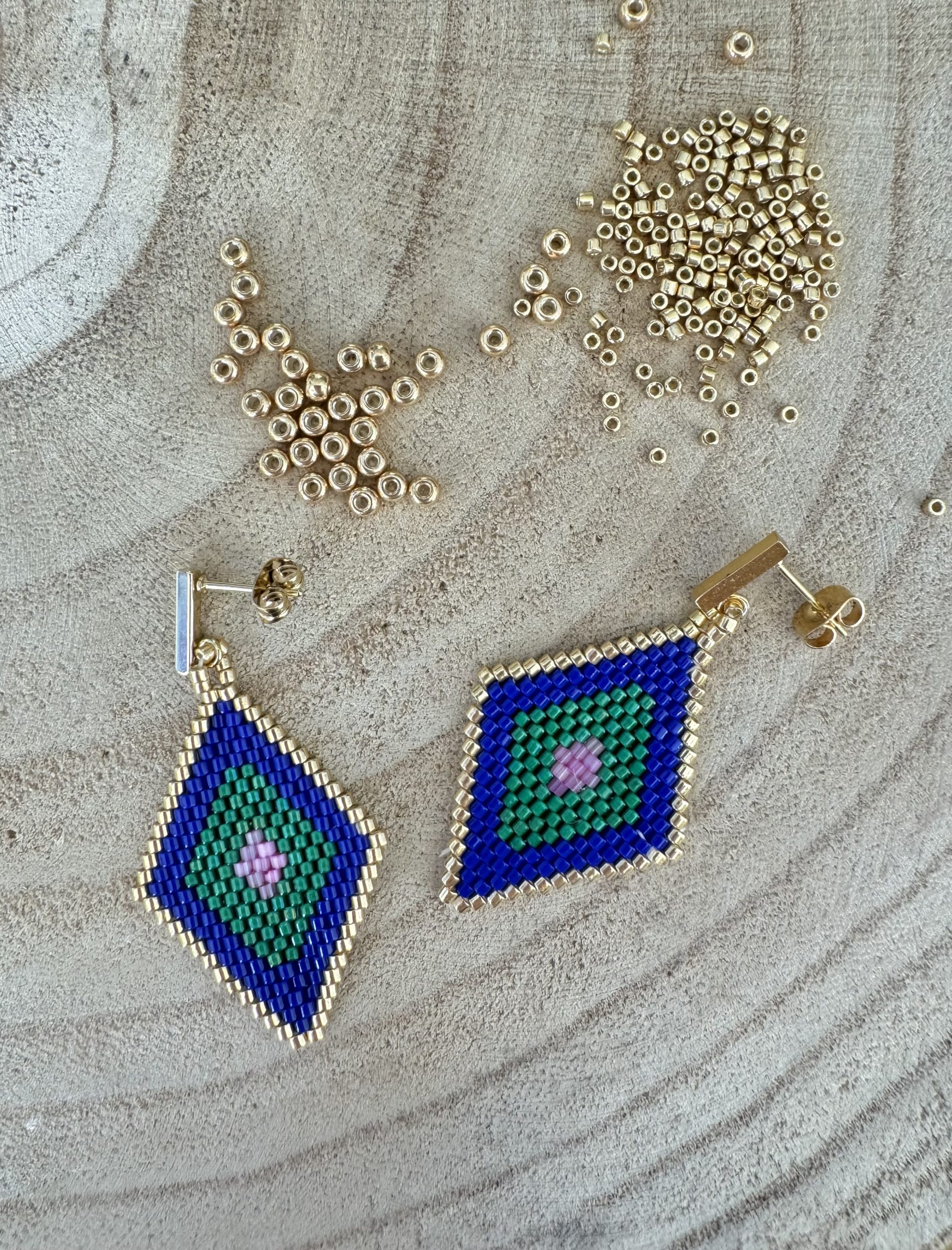 pendientes rombo color azul, verde y rosa, enganche color oro